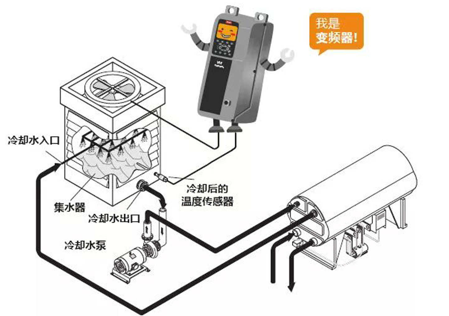 加入變頻器后,操作十分簡(jiǎn)單,設(shè)定制冷機(jī)組所需要的冷卻水溫度、溫度傳感器必要參數(shù),變頻器便可對(duì)冷卻塔的散熱風(fēng)機(jī)轉(zhuǎn)速進(jìn)行實(shí)時(shí)的動(dòng)態(tài)控制啦~