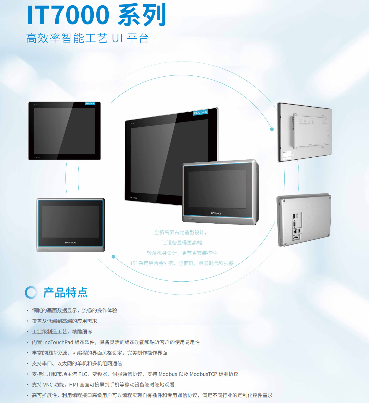 IT7000是匯川基于工控HMI發(fā)展趨勢研發(fā)的全新一代觸摸屏,在顯示效果上有顯著提升,與傳統(tǒng)HMI相比,IT7000通信更加豐富,功能更加全面,具有更強大的數(shù)據(jù)處理能力和更快的響應(yīng)速度。