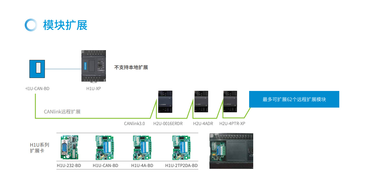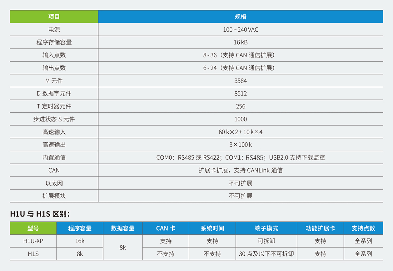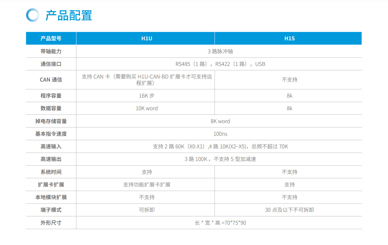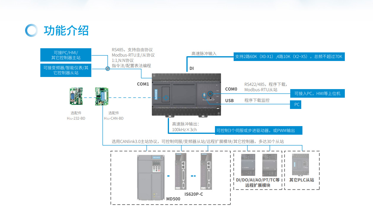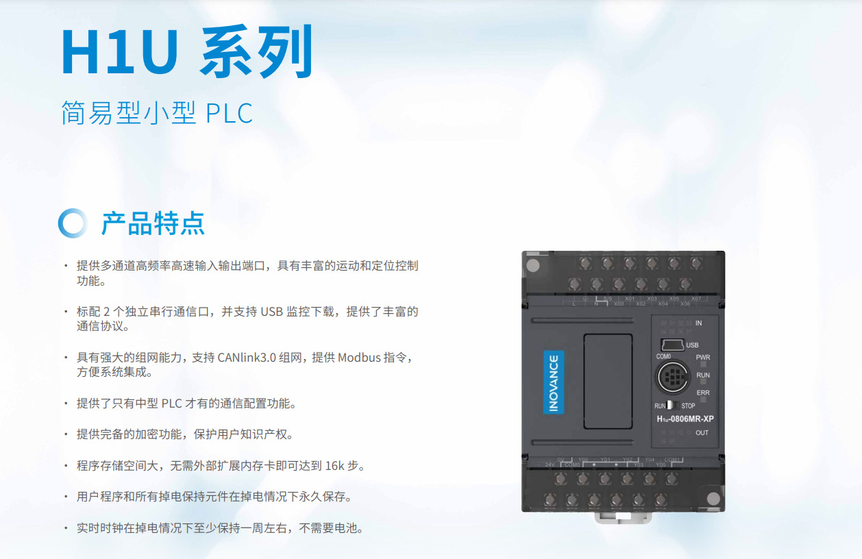 H1U系列PLC 隸屬匯川小型PLC 經(jīng)濟型系列,其主要特點具備小體積,大程序容量,并具備3 軸高速100K 脈沖以便實現(xiàn)高精度定位。支持CANlink 擴展卡擴展H2u 系列的遠程擴展模塊來豐富IO。該系列PLC 點數(shù)覆蓋14~60 點。是小型自動化設備高性價比的選擇。